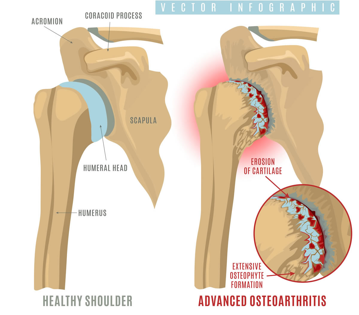 The head of humerus and the glenoid cavity are covered with cartilage which help in friction free movement when the cartilage in the shoulder begins to break down on the surface and eventually in the deeper layers, it’s called Shoulder Arthritis.